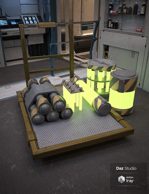 A set of detailed futuristic industrial containment props for your sci-fi renders, that will be a perfect addition to your library. Includes hover platform trolly, and canister props. Optimized for both Iray and 3Delight.